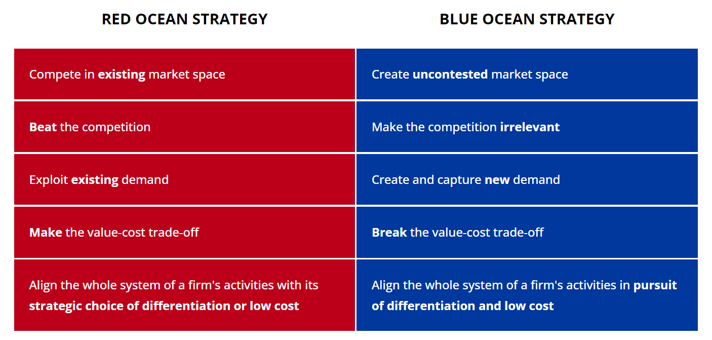 For those who have had some form of strategy training would have inevitably come across the the Blue Ocean strategy. This strategy was designed by professors at INSEAD and also easily applies to this space. While some of the goals of Blue Ocean strategy would be considerably more challenging to implement, they are relevant for the most part.
